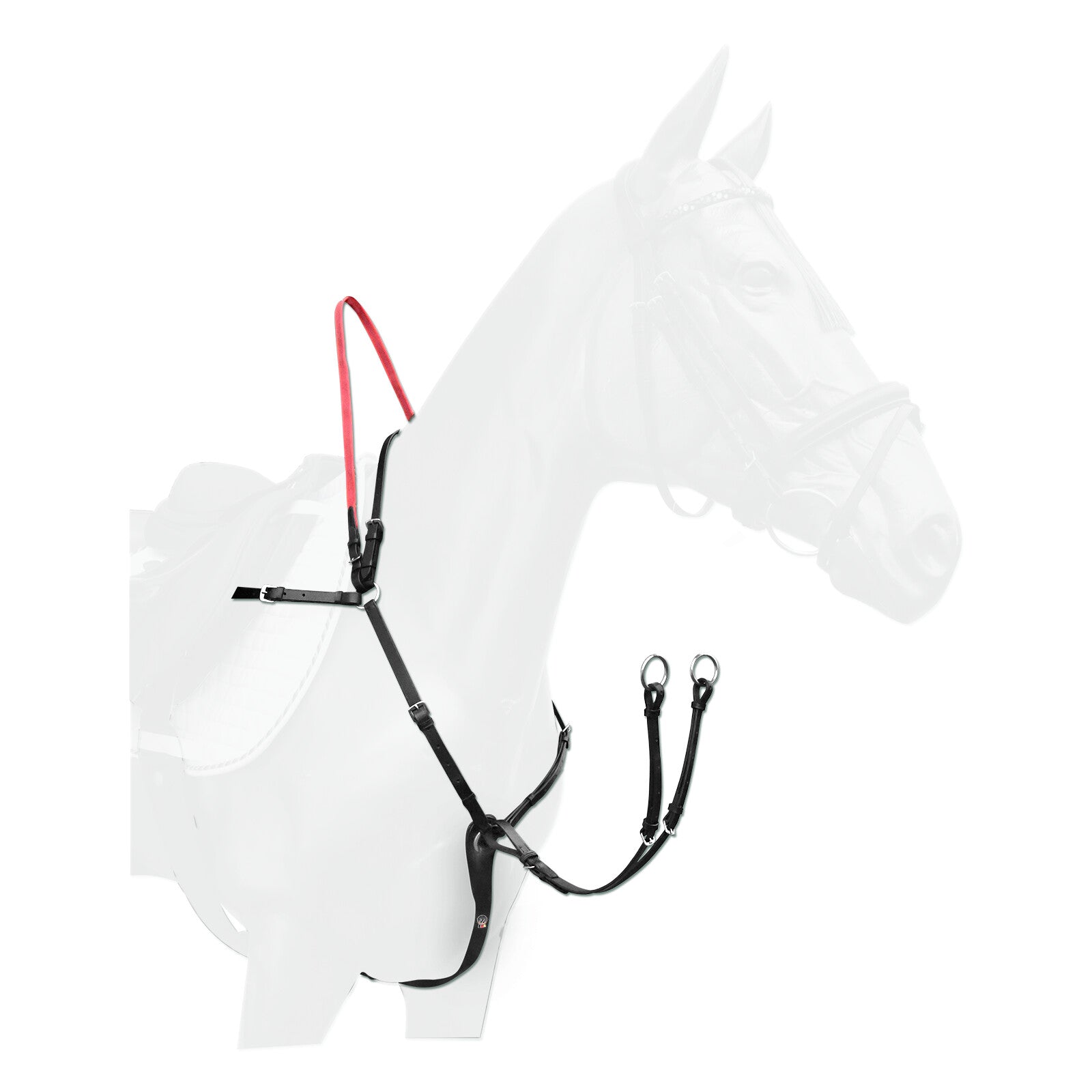 Bovendien kan de combinatie worden toegepast bij jonge of moeilijk te controleren paarden die de neiging hebben verrassende bewegingen te maken ter ondersteuning van de ruiter. De veiligheidsteugel geeft de ruiter ondersteuning wanneer dat nodig is en werkt, door de verbinding met de borstplaat, in op de borst van het paard om de controle over het paard te helpen herstellen.