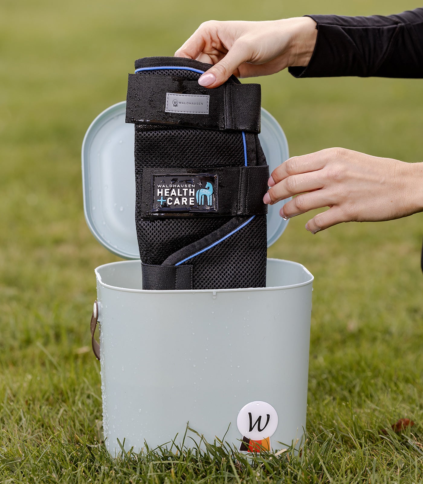 Immerse the Waldhausen Health + Care Ice Layer boots in a bucket of water until the material has soaked in, then wring out and place around the horse’s leg. Thanks to the special materials, the water evaporates slowly and extracts heat in the process for a pleasant cooling effect. For a relaxing application, the horse should stand still, not move freely and not be left unattended.