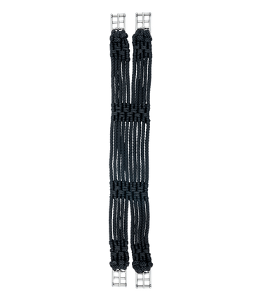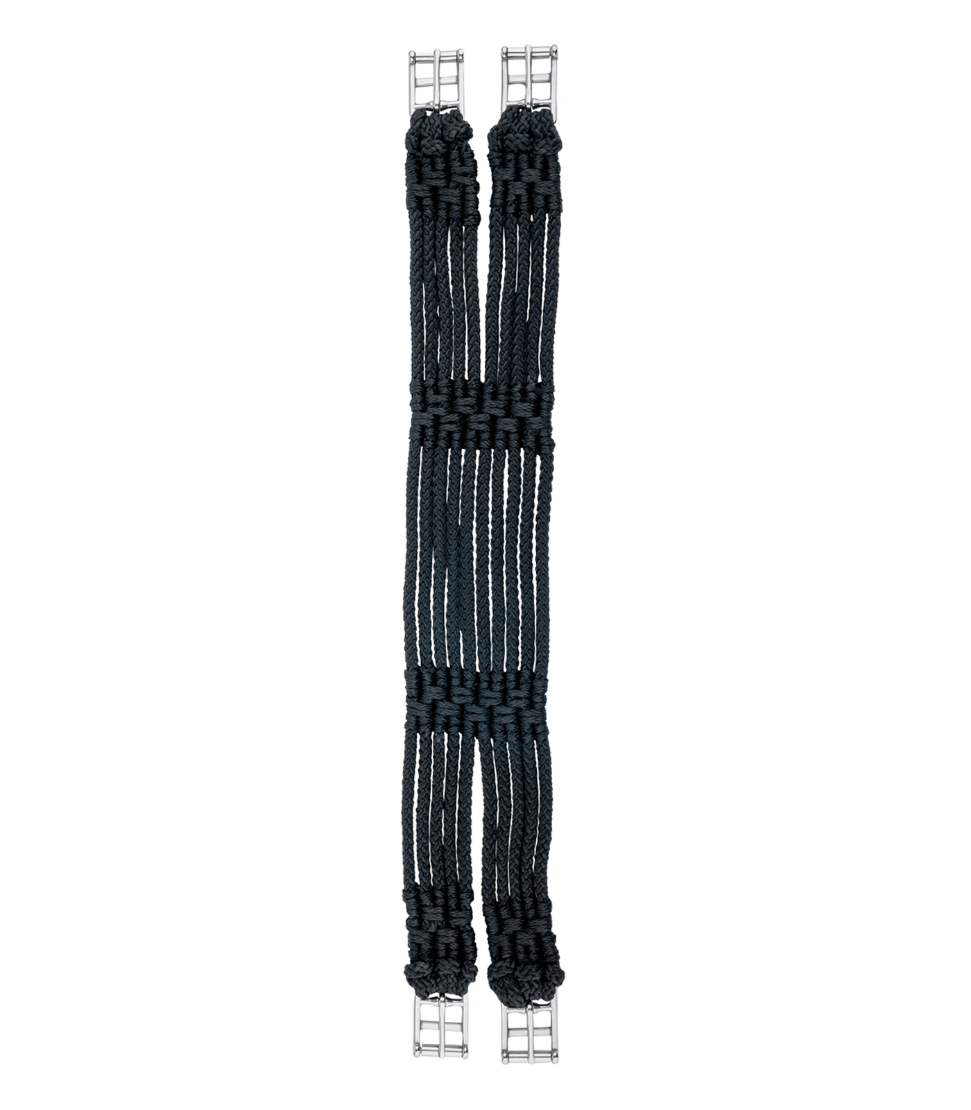 String girth in soft synthetic fibre material with stainless steel buckles. With loops for girth straps. As a short girth, the use of the buckle guard, article 19084, is recommended in order to prevent rubbing.